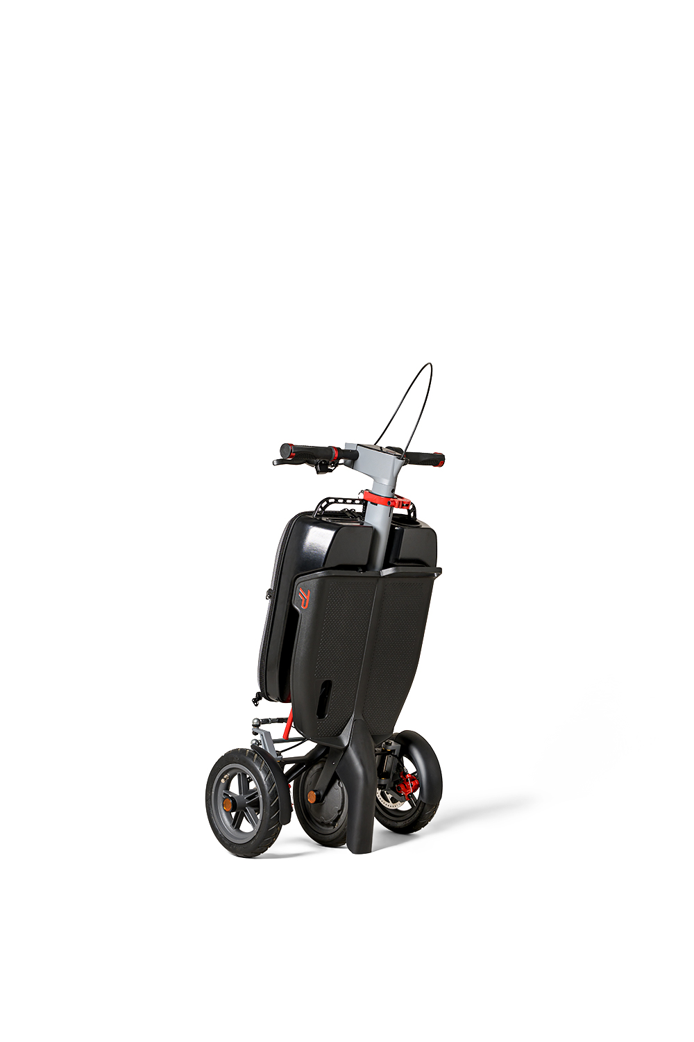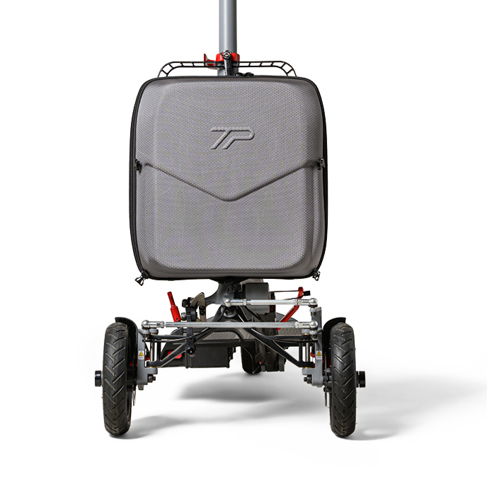 Trollypack incorporates an intuitive folding mechanism that allows the scooter to fold flat and transform into a trolley-like form, enabling users to comfortably roll it alongside them rather than carry its full weight.